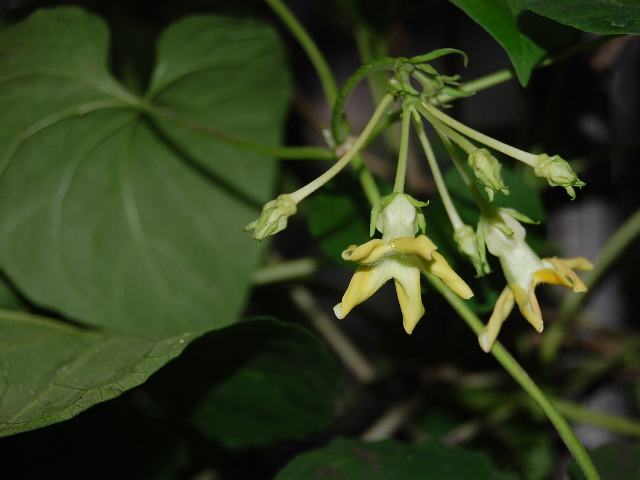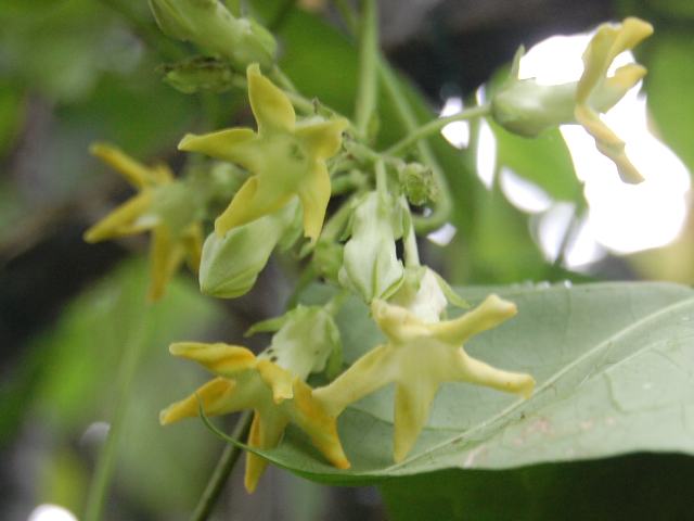 葉の脇に散形花序(枝先に1個つずつ花がつく)を出し、淡い黄緑色をした星形の花をつける。