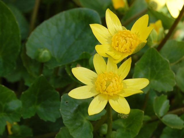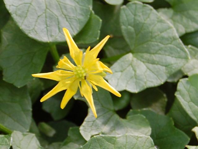 ところで、最近、大船植物園でこの花とおぼしきものを見かけた。花の様子はかなり異なる。菊咲一華(キクザキイチゲ)の名札の下に葉を広げている。初めは花の感じから菊咲一華(キクザキイチゲ)に黄花があるのかと探してみたが、ありそうもない。これは違うと切り換えて葉を見ると、姫立金花(ヒメリュウキンカ)そのものである。そういえば、1つくらい離れた島に姫立金花(ヒメリュウキンカ)の表示があったなと思い出す。ここまで飛んではびこったのであろう。それにしても、花の様子はずいぶん違う。季節の終りにはこういう状態になることもあるのだろうか。宿題にしておこう。